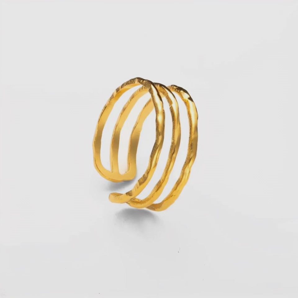 Kolmiosainen säädettävä kullattu sormus. Vedenkestävyys takaa, että voit käyttää tätä korua huoletta hikoillessa, uinnin, liikunnan tai muiden aktiviteettien aikana ilman pelkoa pinnoitteen vaurioitumisesta.
