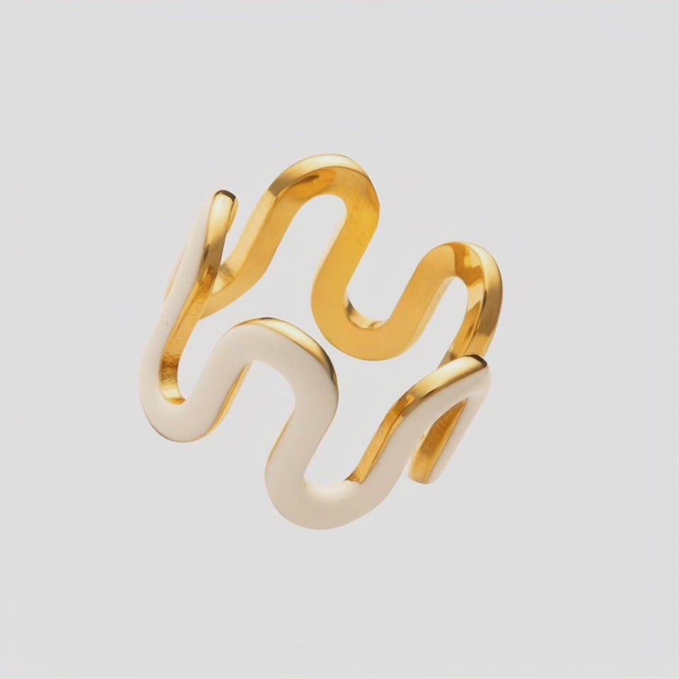 Hauska, geometrinen ja kaunis kullattu valkoisella pinnoitteella oleva sormus. 18k kultaus ja erityinen vedenkestävä pinnoite. Vedenkestävyys takaa, että voit käyttää tätä korua huoletta saunassa, uinnin, liikunnan tai muiden aktiviteettien aikana ilman pelkoa pinnoitteen vaurioitumisesta